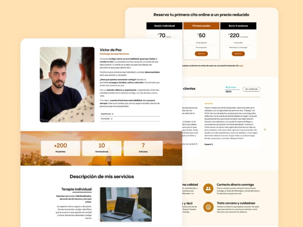 Con la tecnología en auge, cada vez más personas recurren a sesiones con terapeutas online. Por eso, tu página web puede ser la puerta de entrada para la mayoría de tus clientes potenciales.